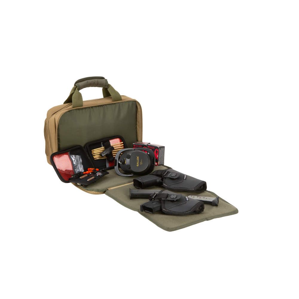 Hauptmerkmale sind zwei große gepolsterte Hülsenfächer für Handfeuerwaffen, acht Magazinfächer, zwei vordere Reißverschlusstaschen für Munition und Zubehör, eine Reißverschlusstasche hinten mit ausklappbarem Schießteppich und ein gepolsterter Tragegriff.