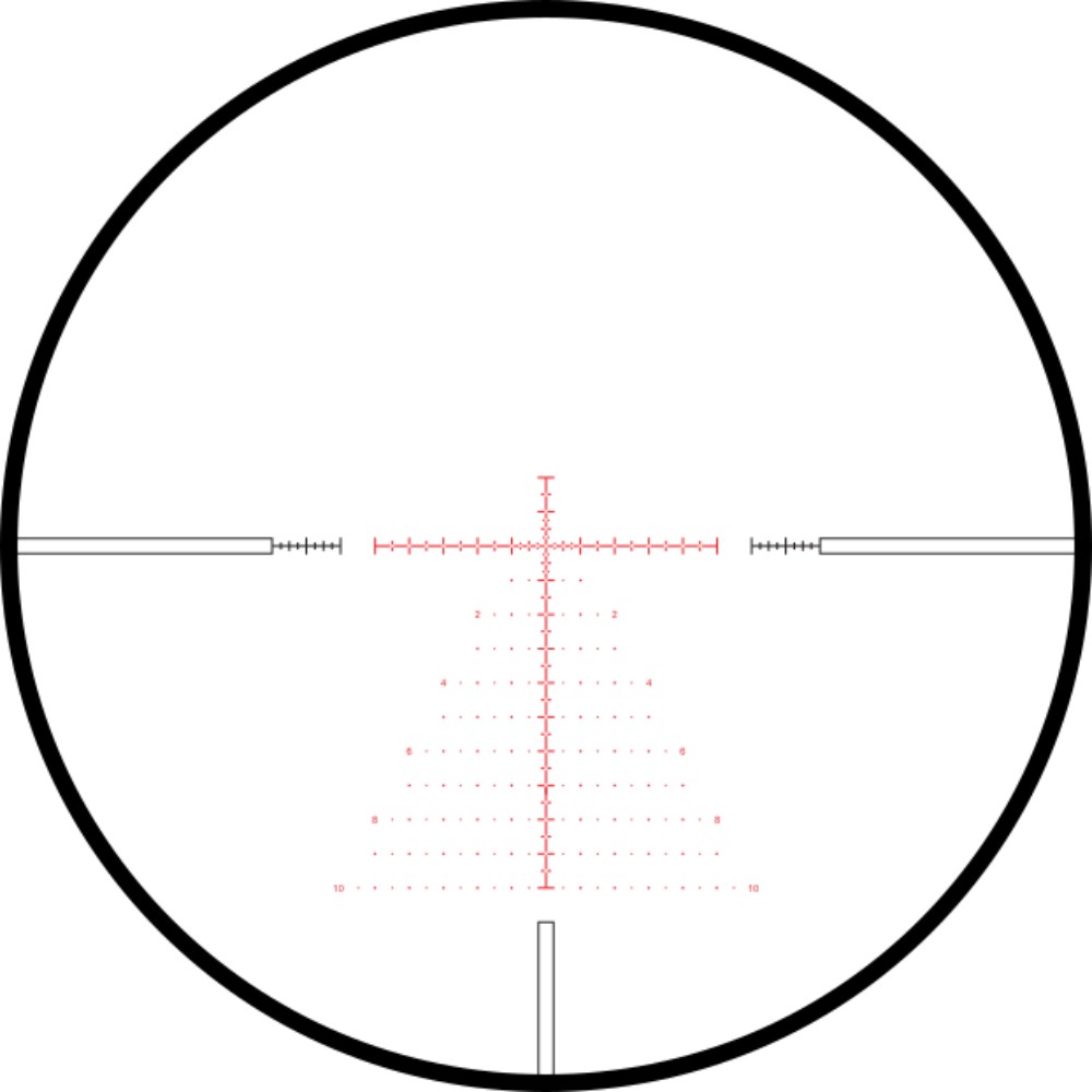 Das Mil Pro Absehen, in roter Beleuchtung mit mehreren Helligkeitsstufen, ermöglicht präzise Schüsse und Entfernungsabschätzungen nach dem MRAD-System. Die Seitenfokussierung erleichtert die Anpassung der Parallaxe, während die 1/10 MRAD-Verstellung pro Klick eine präzise Ausrichtung des Absehens ermöglicht. Die Vollständige Mehrfachvergütung der Linsen gewährleistet maximale Lichttransmission und Kontraste.