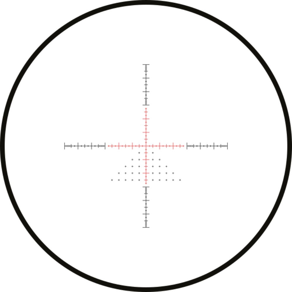 Das FFP Half Mil Absehen, sowohl in roter als auch grüner Beleuchtung, bietet präzise Haltepunkte, die sich unabhängig von der Vergrößerung ändern. Die Seitenfokussierung erleichtert die Anpassung der Parallaxe, während die 1/10 MRAD-Verstellung pro Klick im FFP (First Focal Plane) und die Vollständige Mehrfachvergütung der Linsen maximale Lichttransmission und Kontraste gewährleisten.