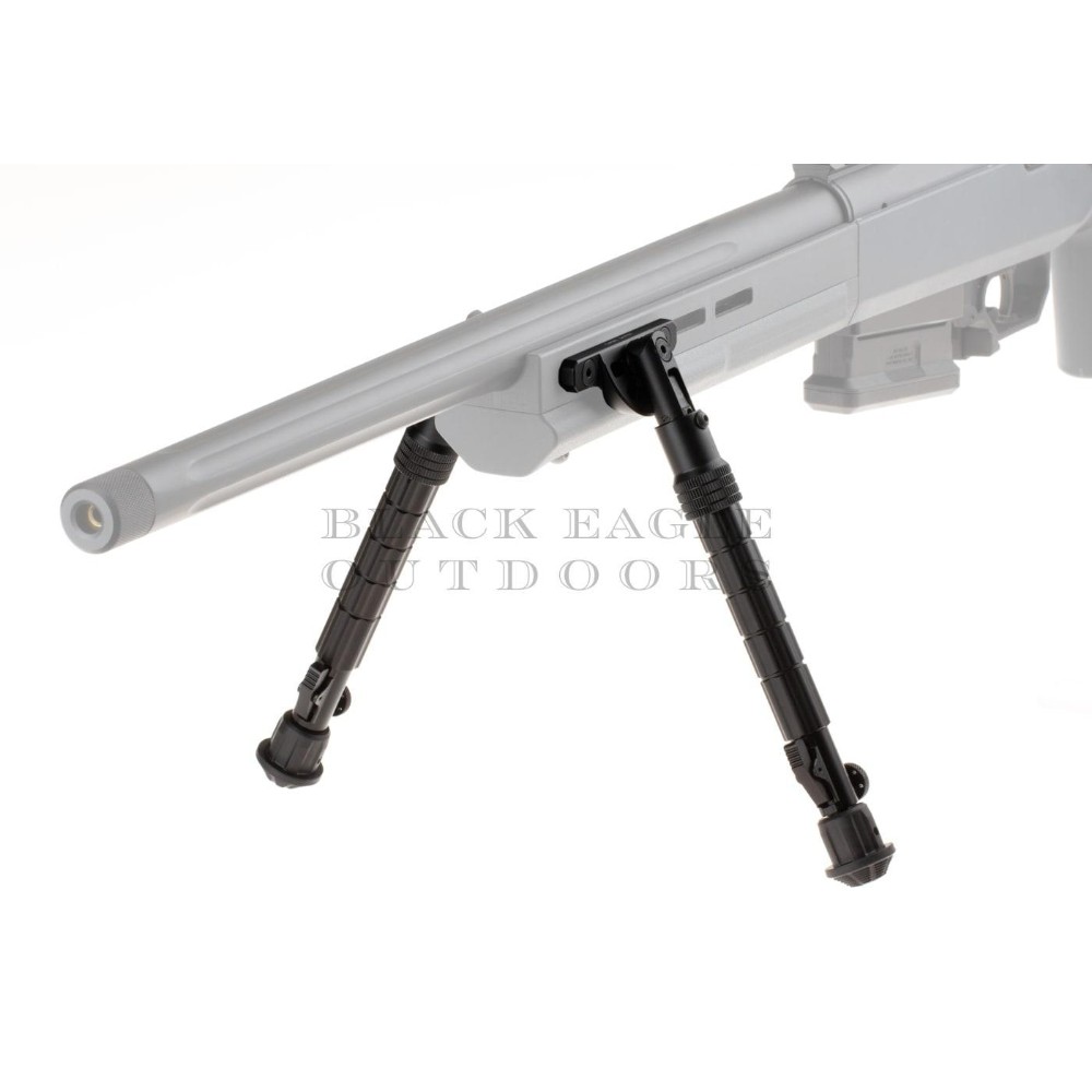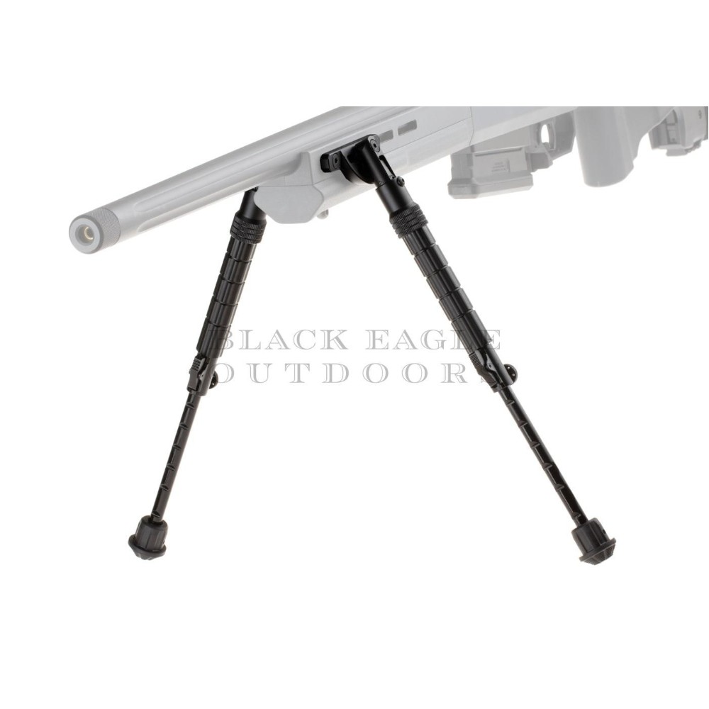 Das leichte Zweibein ist mattschwarz eloxiert und mit fünf vorgestanzten, ausziehbaren Längen und flexiblen Zwischenpositionen ausgestattet, die über ein Daumenrad arretiert werden können.