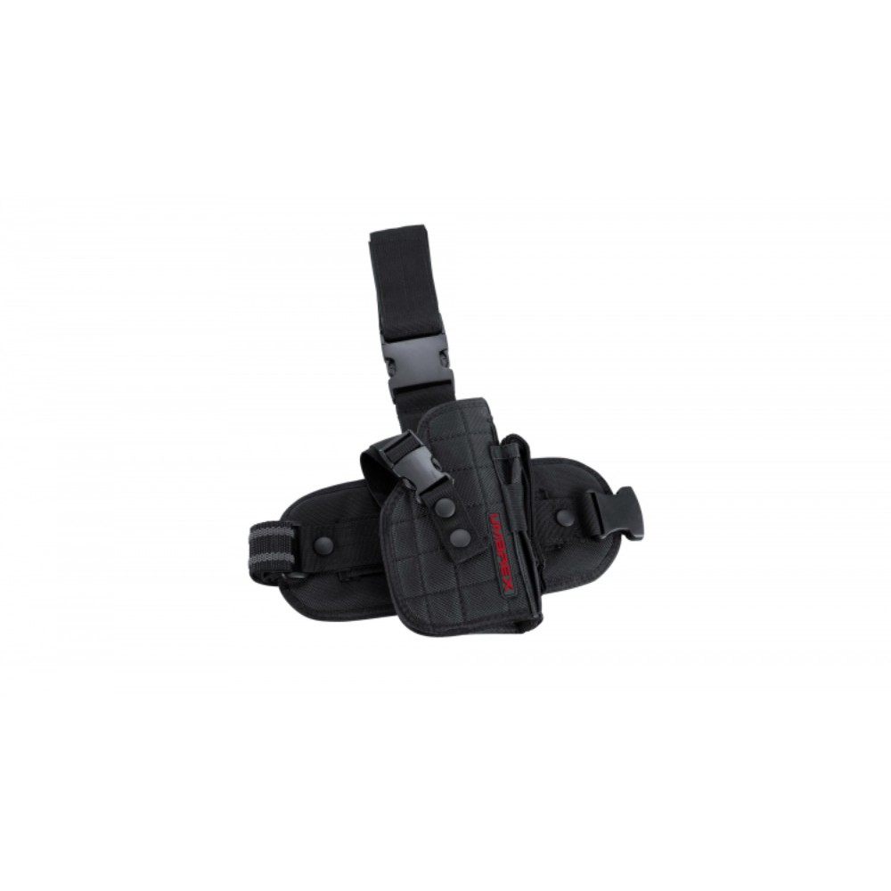 Das Oberschenkelholster aus unempfindlichem Nylon ist preislich attraktiv. Den absolut sicheren Sitz garantiert der verstellbare und innenseitig genoppte breite Beinriemen. Für das schnelle An- und Ablegen an Koppel bzw. Gürtel sorgt das Quick Release-Buckle-System.