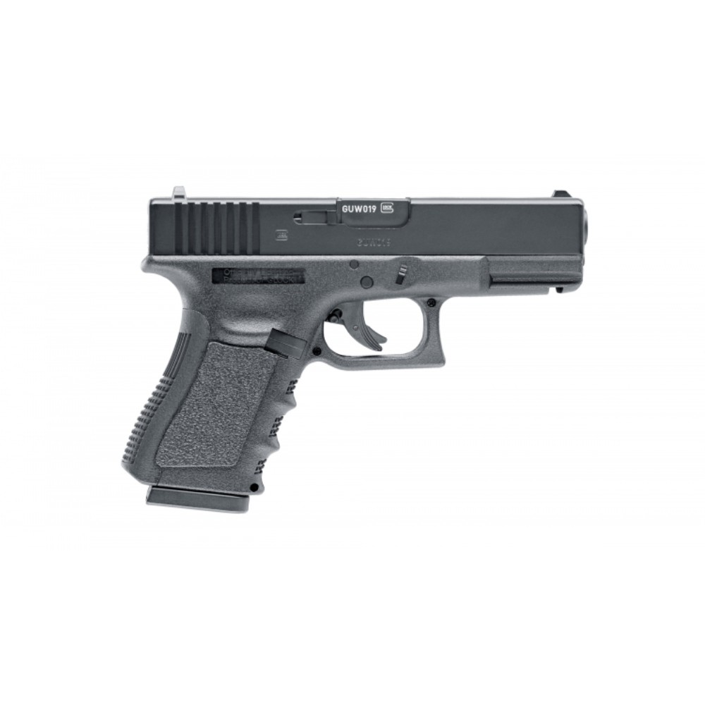 Mit viel Power kommt der kleine Bruder der GLOCK 17 daher: Die kompakte, 186 mm lange GLOCK 19 in der Airsoft-CO₂-Ausführung bietet hohe Leistung auf kleinem Raum. Sie punktet mit schwerem Metallschlitten und einer Abzugszüngelsicherung, die dem Original in nichts nachsteht. Die 6 mm BBs verlassen den Lauf mit einer Mündungsenergie von maximal 2 Joule. Praktisch: Im Griff findet neben dem Magazin auch der Schlüssel zum Einsetzen der CO₂-Kapsel Platz. Die GLOCK 19 bringt trotz ihrer geringen Größe ein gutes Gewicht von 717 g auf die Waage.