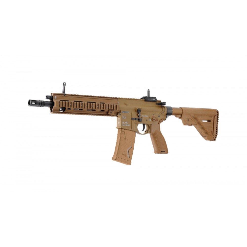 Allein optisch sticht das Magazin mit dem aktuellen Design der Generation 3 heraus. Es fasst 120 Schuss, ist wahlweise allerdings ebenfalls auf 30 Schuss umschaltbar. Typisch für die A5-Version der HK416 ist die Bedienung vollständig ambidextrous. Der Feuerwahlhebel, der Verschlussfang und die der Magazinhalter sind beidseitig bedienbar und auf der oberen Schiene der Picatinny-Quadrail ist eine Flip-Up-Visierung angebracht.