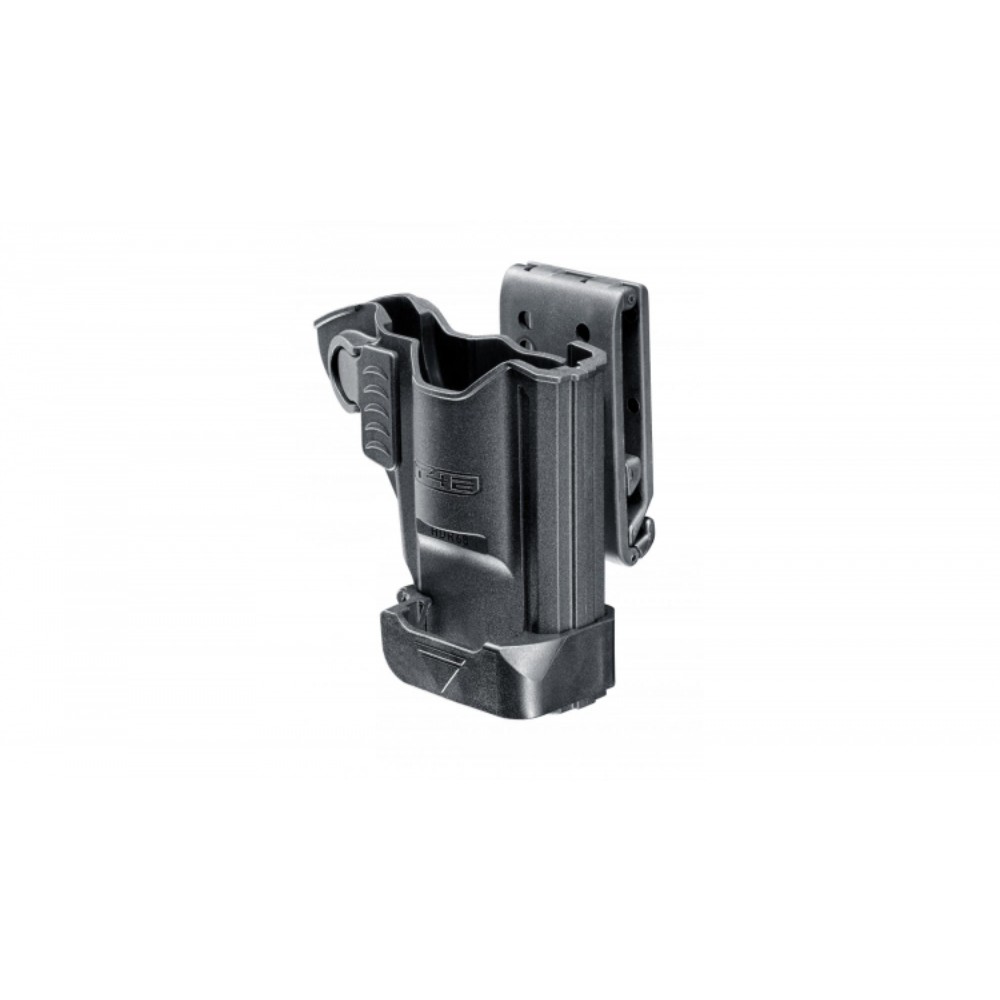 Passgenau konzipiert für den T4E Home Defense Revolver 68, besteht das Holster aus stoß- und schlagfestem Polymer-Kunststoff. Der federgelagerte Release-Button ist intuitiv platziert, und die Gürtelaufnahme ist höhenverstellbar und lässt sich auf die passende Gürtelbreite einstellen. Ein Clip an der Außenseite bietet Platz für eine bereits vorgeladene Ersatztrommel.