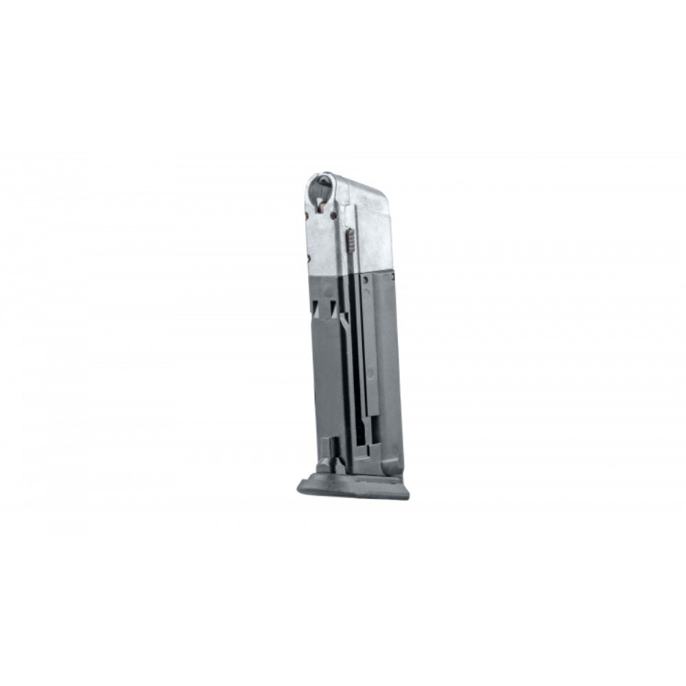 All-In-One Magazin für CO₂-Kapsel und 8 Schuss im Kaliber .43. Lieferung mit zwei verschiedenen Federn – schwarz für Vollkugeln (alle Rubber-/Polyballs) und eine weichere (silberne) Feder für alle Kugeln mit Füllung (Farbe, Kreide, Pfeffer).
