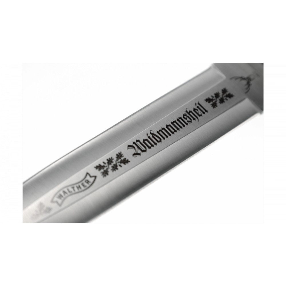 Die Jagd stellt hohe Anforderungen an klassische Saufänger wie das Walther La Chasse. Nur ein gezielter Stich garantiert das sofortige Verenden des Stückes. Daher setzt dieses Abfangmesser auf eine knapp 240 mm lange und 40 mm breite Klinge mit Hohlkehle. Die qualitätsversprechende Walther-Schleife, das Bruchzeichen des letzten Bisses sowie der Gruß für die erfolgreiche Jagd zieren den robusten 440C. Zwischen Klinge und Pakkawood-Griffschalen sitzt das stählerne Parierelement mit der Aufschrift La Chasse – die Jagd. Anders als die Saufeder wird der Saufänger bequem in der mitgelieferten Lederscheide am Gürtel getragen.