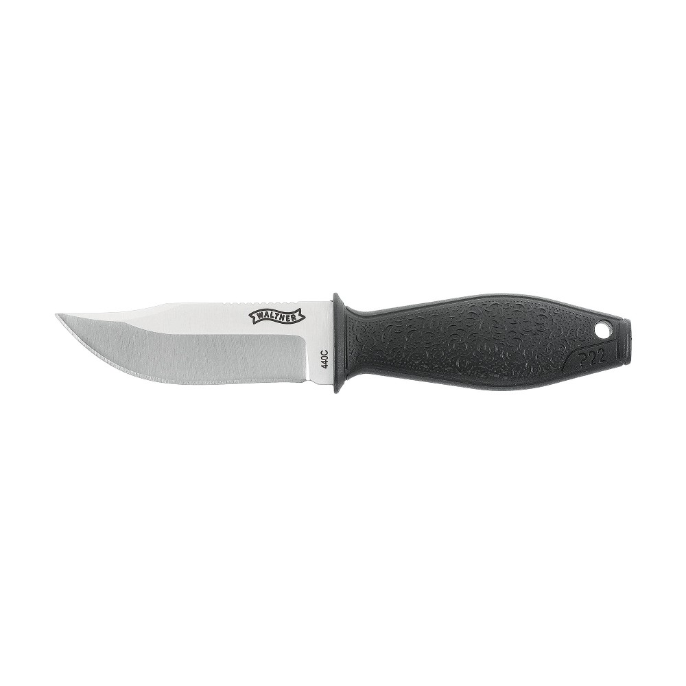 Getragen wird das Walther P22 BSK in der Kydexscheide um den Hals an einer Kugelkette mit Paracord-Ummantelung. Eine Fangriemenöse verlängert den Griff und erleichtert das Ziehen des Messers.
