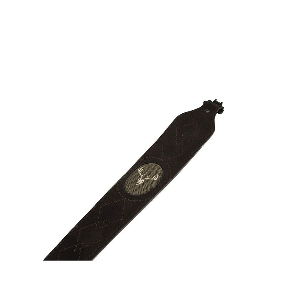 Der Big Game Wildlederriemen verfügt über eine Wildlederoberfläche mit dekorativen Nähten, die eine bestickte Hirschsilhouette umrahmen. Das Wildlederfutter sorgt für einen rutschfesten Halt auf der Schulter. Die Riemen sind auf eine Belastung von 250 kg getestet.